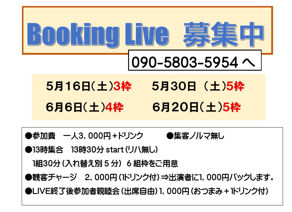 毎月土曜日1~2回開催(予定)するライブです。